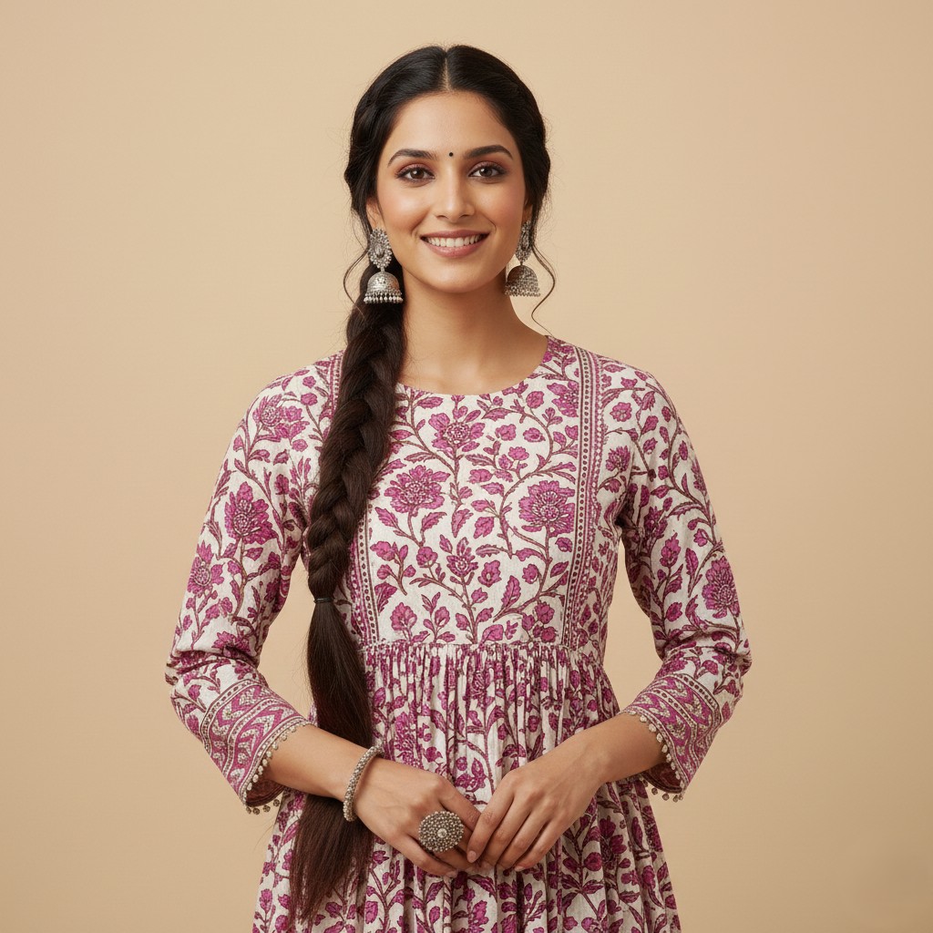 Embrace a romantic and festive aesthetic with this ivory and fuchsia tiered Anarkali dress, featuring an intricate floral trail design. This floor-length ensemble combines traditional craftsmanship with a feminine, flowing silhouette, making it an exquisite choice for weddings, festive celebrations, or elegant evening gatherings.